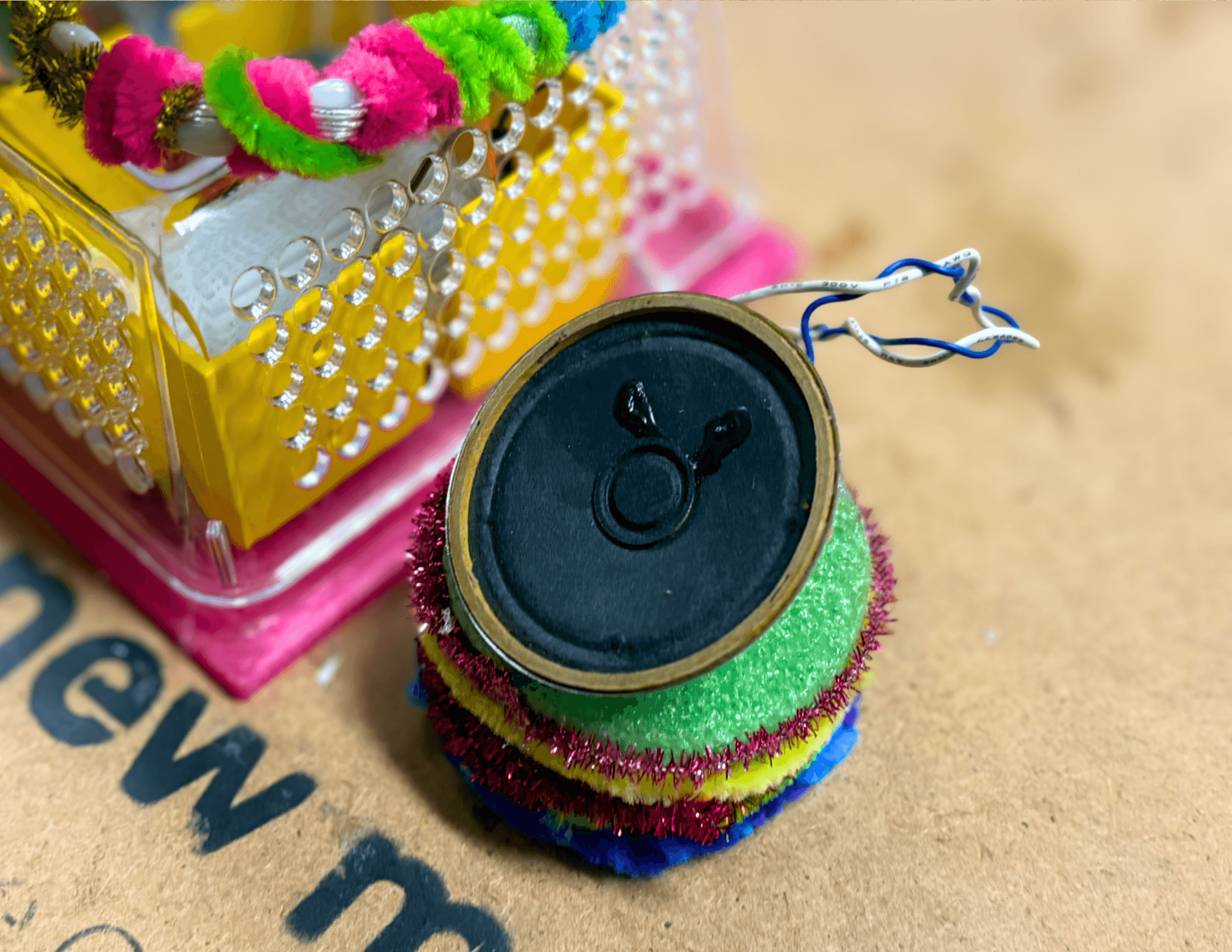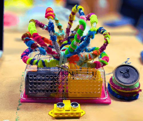 As the participant “walks” their hand over it – The rainbow lights and electronic music change patterns, flow and speed. It’s intentional modular design, use of mixed materials, upbeat song and bright colours are meant to evoke feelings of excitement, wonder and pure eye-sparkling joy.